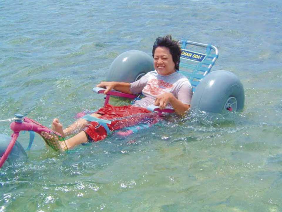 이 비치에서는 노인과 장애인을 비롯한 휠체어 이용자들도 물 속에 들어갈 수 있도록 체어보트 대여 서비스를 제공합니다.