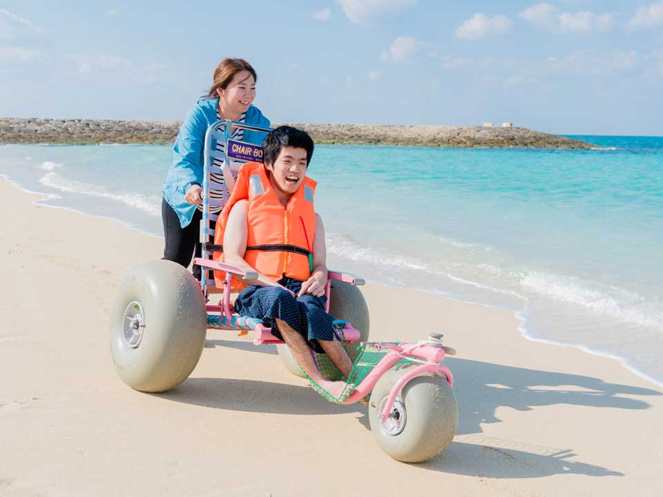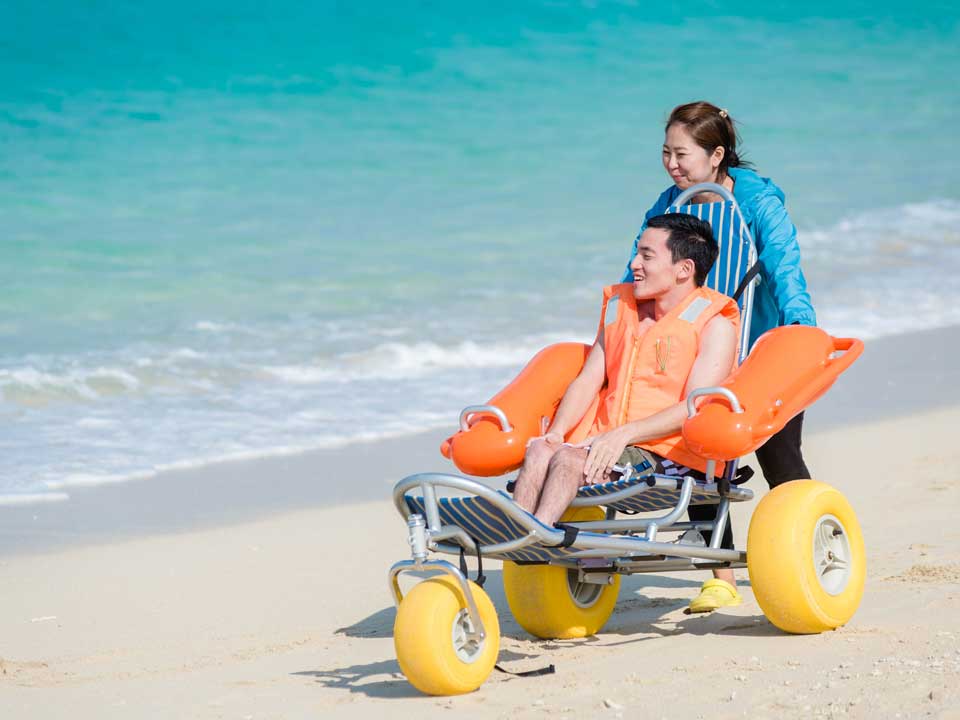 這座海灘可提供水陸兩用輪椅的租借服務,使用輪椅的老年人或身障人士都能在此享受戲水之樂。